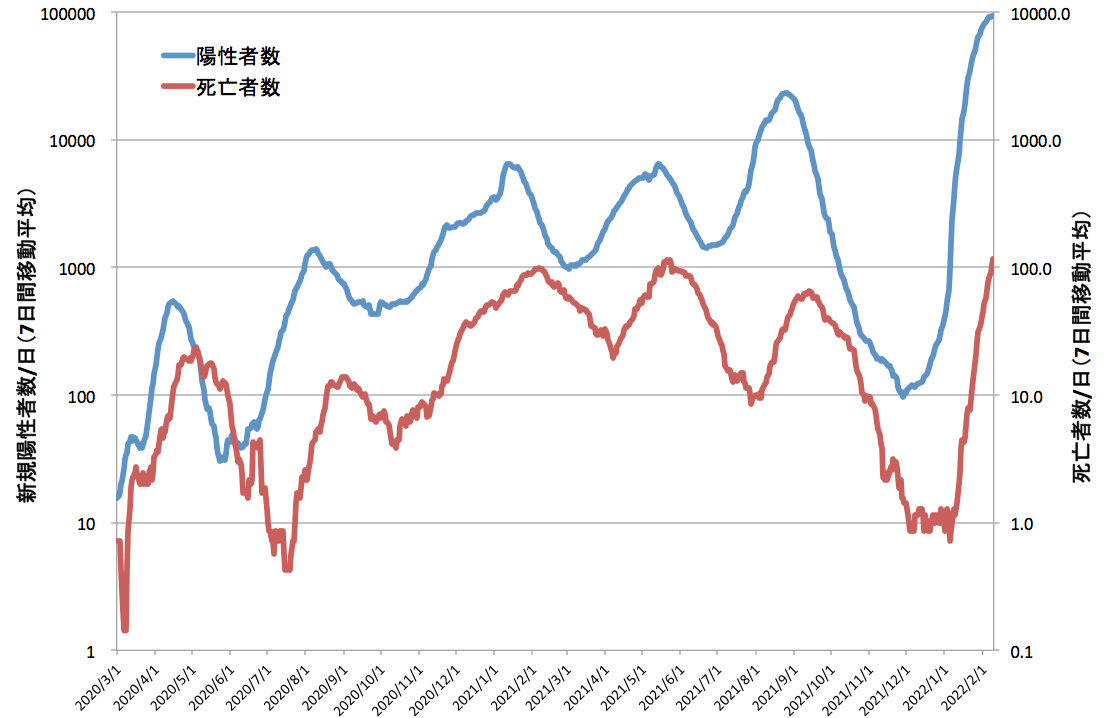 さらに4点目になるが、昨日(2/9)の死亡者数の7日間移動平均値が116.0人となって、過去最多だった第4波のさなかだった昨年5月21日に記録した113.3人を上回った。今回はタイミングが遅くなったが、NHKのデータに基づく対数グラフを以下に示す。赤線が死亡者数の7日間移動平均値である。