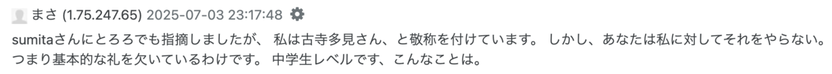 弊ブログの二大ノイズ源の片方、あまりにもコメントが短かったのと、記事自体のタイトルが短かったために、普段は本文が隠れて読めないスマホでも文面が目に入ってしまった。下記がそのコメント。