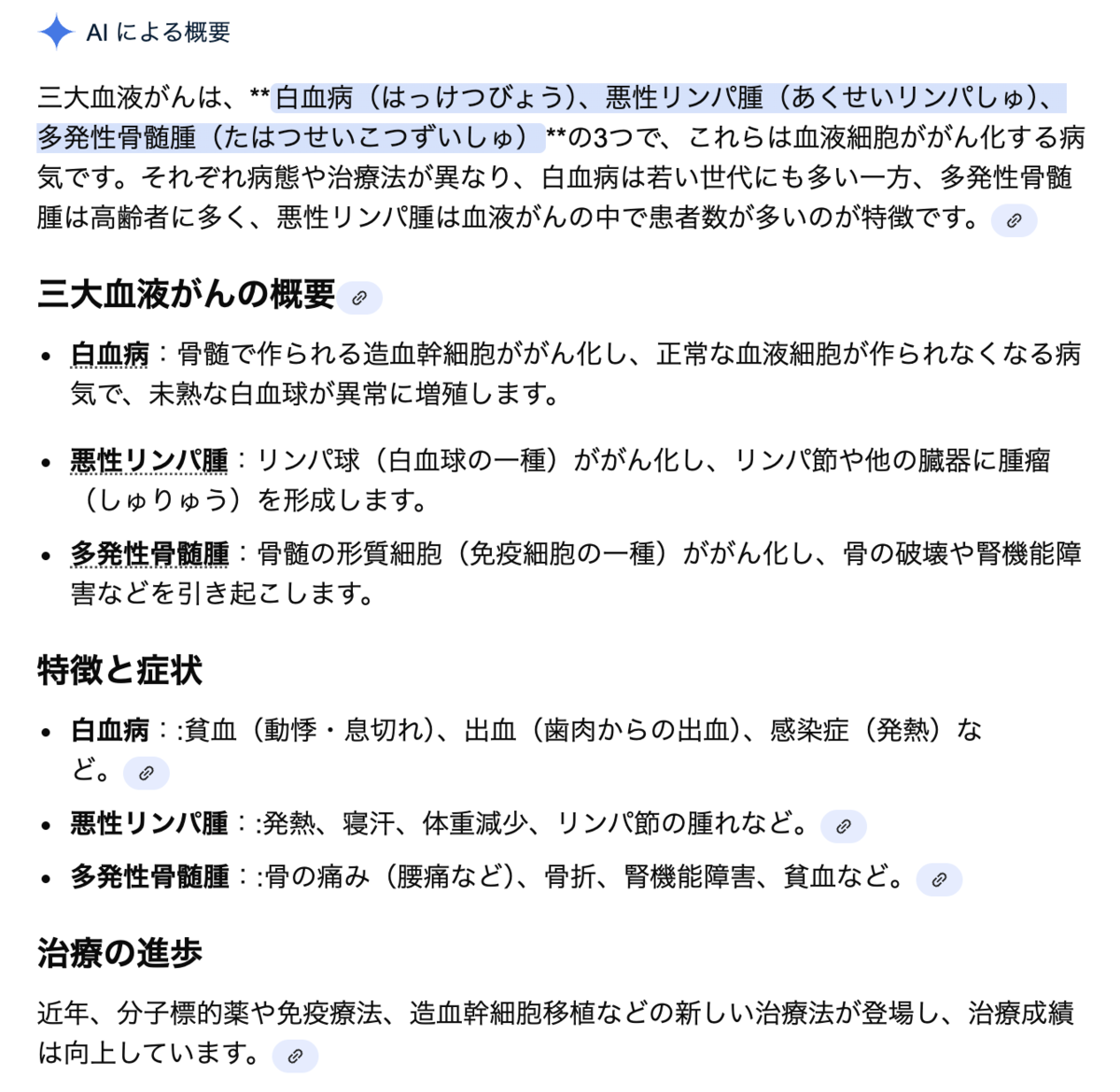 私の身内に「三大血液がん」のうち2つに罹患して、その2つ目で命を落とした人がいる。しかし山本太郎が「予備軍」になっているという多発性骨髄腫はそのいずれでもない。以下にAIの回答を示す。