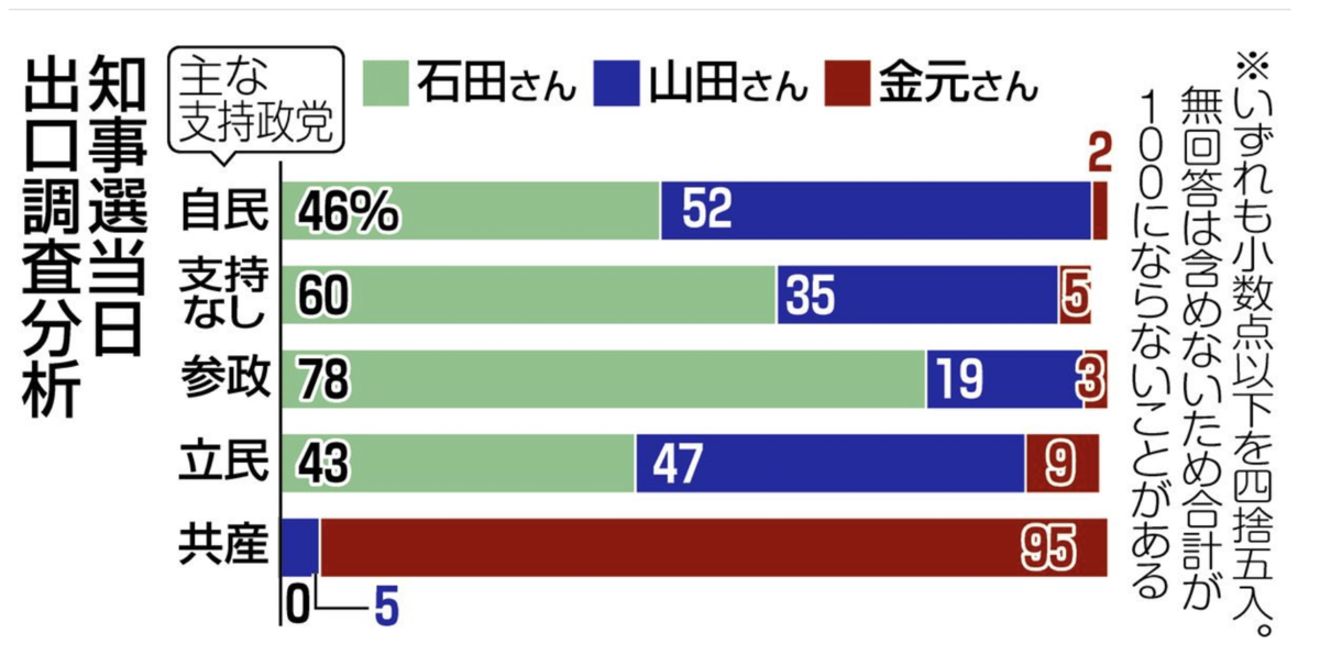 当選した石田嵩人という「史上最年少知事」(35歳)は参政党員ではなく無所属の自民党友で、その前は国民民主党(民民)の党員だったらしい。その石田が選挙戦中に突然「移民反対」を言い出したり、日本は「単一民族」だという妄言を口にしたあたりから戦局が急変し、まさかの逆転勝利になったようだ。そんなトンデモ候補に立民支持層の43%がなびいた。立民支持層ももはや山本元号新選組の支持層を嗤えなくなった。